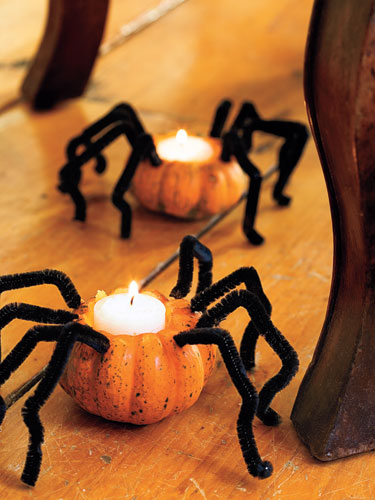 Push black pipe cleaners into pumpkin to make legs and add tealights!
